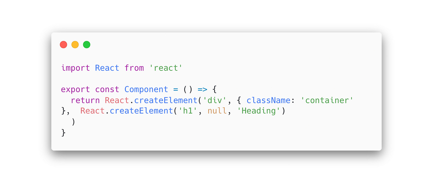 For instance, consider the transformation from pure JavaScript to JSX in defining React components: